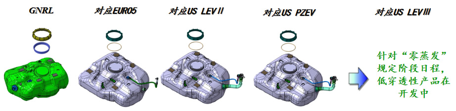 为对应北美的HC渗透的LEVⅢ法规,将构成零件进行内置燃油箱内,从而开发的低渗透燃油箱。并且,低公害・高燃油性汽车由于配置了怠速停止功能,会引起油箱内的燃油摇动音的发生,为提高控制摇动音,在油箱内嵌入了隔音板,从面实现了轻量化技术同步开发的同时,也将燃油系统更进一步提高。